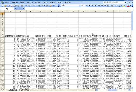 五、分析报告如下:原始数据表格(有效物编号,周长,等积圆直径,圆度,等周长圆直径,孔洞面积,不含洞面积,更小矩形区等30几种数据。)